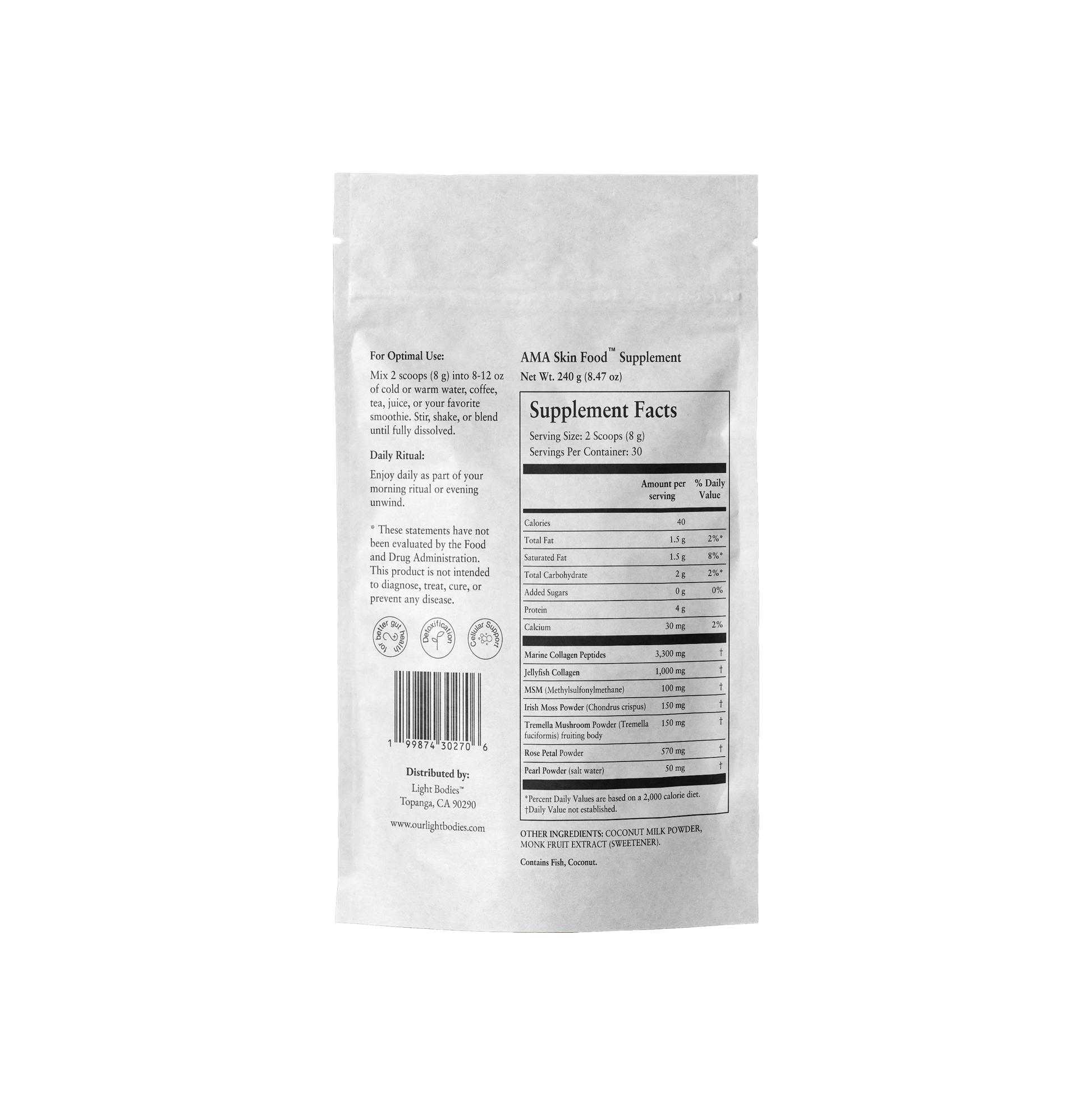 Light Bodies’ Ama Skin Food is our hero ingestible collagen supplement an ocean-sourced beauty ritual crafted with marine collagen and jellyfish collagen, produced with IBITTA (Ibitta Enterprises Inc.), an SQF Food Safety Code Level 2 (GFSI) audited facility with QAI organic certification and third-party audits.