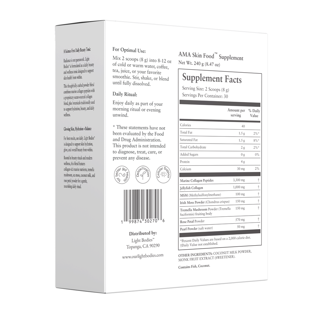 A new era of beauty and wellness begins with two daily scoops. Light Bodies, AMA Skin Food blends high-frequency, whole-food nutrients to support skin, gut, and cellular renewal naturally.